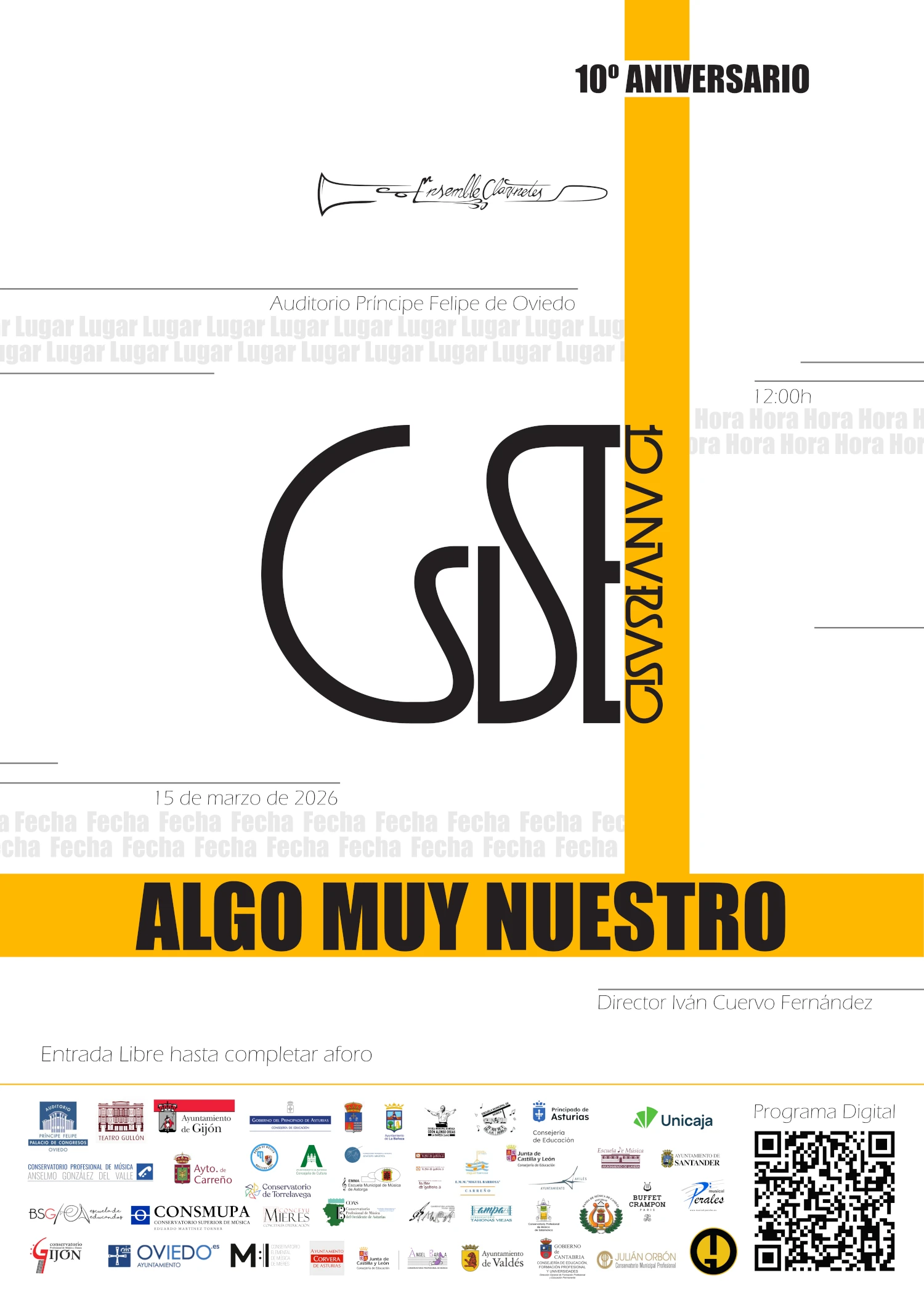 En el concierto actuará un gran ensemble de clarinetes formado por profesorado y alumnado de dieciocho conservatorios y escuelas de música diferentes, con un repertorio que gira en torno a la música española y a la figura de Manuel de Falla con motivo del 150º aniversario de su nacimiento.